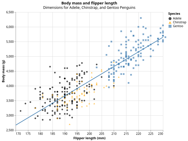 vlShow penguinPlotNow we have something that looks like what we might think of as a “scatterplot”. It doesn’t yet match our “ultimate goal” plot, but using this plot we can start answering the question that motivated our exploration: “What does the relationship between flipper length and body mass look like?” The relationship appears to be positive (as flipper length increases, so does body mass), fairly linear (the points are clustered around a line instead of a curve), and moderately strong (there isn’t too much scatter around such a line). Penguins with longer flippers are generally larger in terms of their body mass.